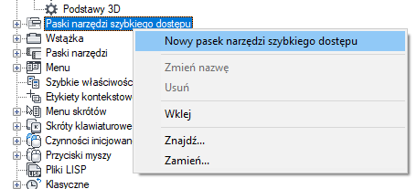 1. Na karcie Dostosuj w panelu Dostosowywane pliki: <nazwa pliku> kliknij znak plusa (+) obok węzła Paski narzędzi szybkiego dostępu, aby go rozwinąć.