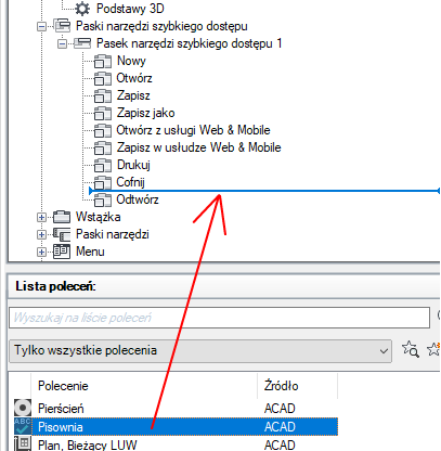 3. Na panelu Lista poleceń przeciągnij polecenie lub element sterujący, który chcesz dodać do paska narzędzi szybkiego dostępu, na panelu Dostosowywane pliki: <nazwa pliku>.