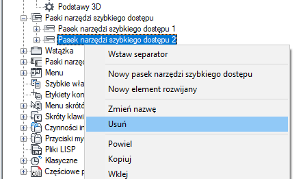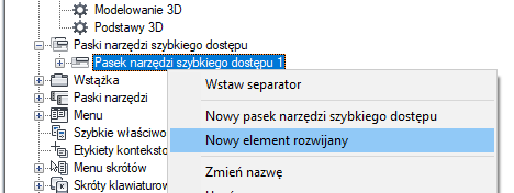 Nowy pasek narzędzi szybkiego dostępu (o nazwie Pasek narzędzi szybkiego dostępu1) zostanie umieszczony u dołu węzła Paski narzędzi szybkiego dostępu.