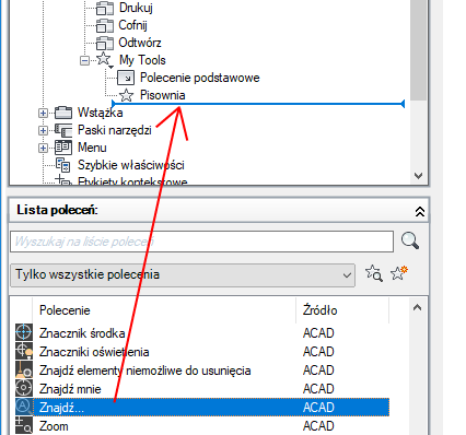 6. Na panelu Lista poleceń przeciągnij polecenie lub element sterujący, który chcesz dodać do listy rozwijanej na panelu Dostosowywane pliki: <nazwa pliku>>.