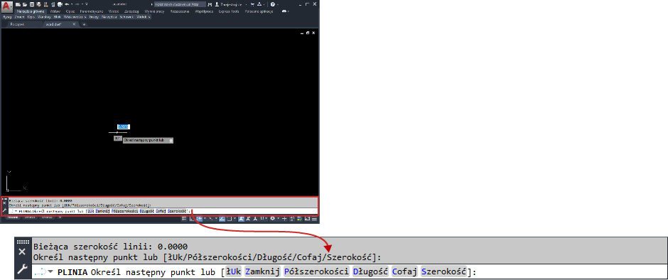 Zadokowane okno poleceń ma taką samą szerokość jak okno aplikacji. Jest wyświetlane w stałym miejscu powyżej lub poniżej obszaru rysunku.