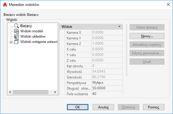 W przypadku widoków modelu i układu wyświetla bieżącą pozycję kamery.