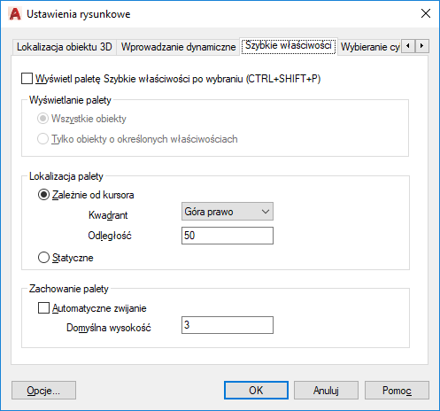 Określa ustawienia wyświetlania palety Szybkie właściwości. Aby uzyskać więcej informacji, zobacz Dostosowywanie Szybkich właściwości.