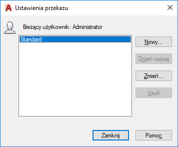 Zmienia nazwę aktualnie wyróżnionego ustawienia przekazu.