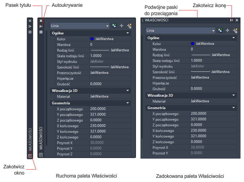 Okna, takie jak wstążka, paleta Właściwości, palety narzędzi, okno Polecenie i panel DesignCenter, można dokować, kotwiczyć lub ustawiać jako przestawne. Ustawienia dla tych i innych opcji są często zmieniane w menu skrótów, które jest otwierane przez kliknięcie prawym przyciskiem myszy paska tytułu palety lub okna.
