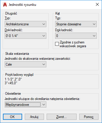 Wartości to Architektoniczny, Dziesiętny, Inżynierski, Ułamkowy i Naukowy. Formaty Inżynierski i Architektoniczny tworzą rysunki w stopach i calach i zakłada się, że każda jednostka rysunku odpowiada jednemu calowi. Inne formaty mogą reprezentować wszelkie istniejące jednostki.