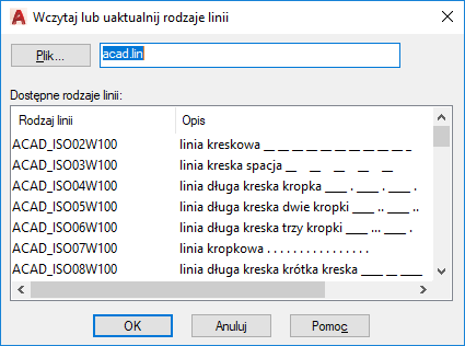 Wyświetla okno dialogowe Wybierz plik rodzajów linii, w którym można wybrać inny plik rodzajów linii (LIN).