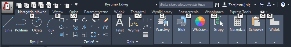 Zamiast urządzenia wskazującego można użyć klawiszy, aby dokonać wyboru z menu, paska narzędzi szybkiego dostępu i wstążki. Aby dowiedzieć się, które klawisze są dostępne w bieżącym obszarze roboczym, naciśnij klawisz Alt.