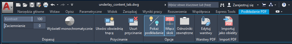 Po wybraniu podkładania PDF na wstążce zostanie wyświetlona karta kontekstowa PDF.