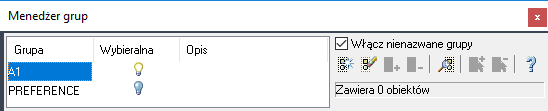 Jeśli grupa nie jest wybieralna, ikona żarówki nie będzie dostępna, zaś wybranie jednego elementu grupy nie spowoduje wybrania żadnego innego. Jeżeli zmienna systemowa PICKSTYLE ustawiona jest na 0, żadna grupa nie jest wybieralna.