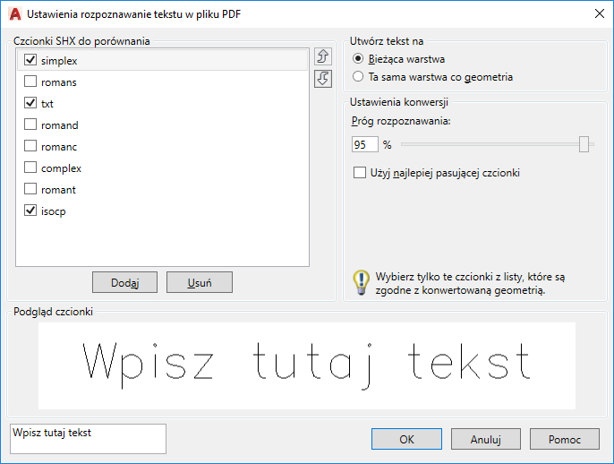 Wyświetla listę czcionek SHX w celu wybrania najlepiej pasujących do wybranej geometrii SHX. Kolejność wybranych czcionek SHX ma znaczenie. Wybrane czcionki są porównywane z wybraną geometrią SHX w celu dopasowania, zaczynając od góry listy, dopóki dopasowanie nie będzie równe podanej Wartości progowej rozpoznania. Przy użyciu przycisków strzałek można przesuwać wybrane czcionki w górę lub w dół listy. Niezaznaczone czcionki są ignorowane. Należy zwrócić uwagę na następujące kwestie: