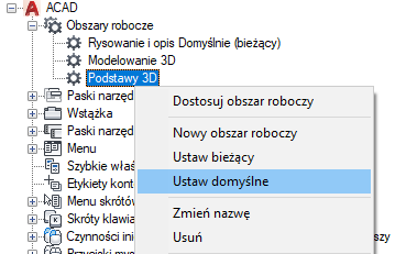 Obszary robocze w pliku CUIx mogą być oznaczane jako domyślne. Ustawienie obszaru roboczego jako domyślnego określa, że ma on zostać przywrócony podczas wczytywania pliku CUIx do programu po raz pierwszy lub po wczytaniu pliku CUIx za pomocą polecenia WCZYTAJCUI.