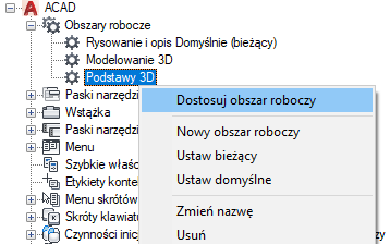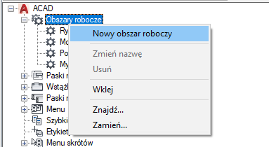 2. Na karcie Dostosuj, w panelu Dostosowywane pliki: <nazwa pliku> kliknij prawym przyciskiem węzeł Obszary robocze, a następnie kliknij opcję Nowy obszar roboczy.
