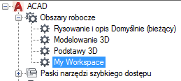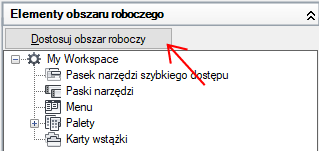 2. Na karcie Dostosuj, na panelu Dostosowywane pliki: <nazwa pliku> kliknij znak plusa (+) obok węzła Obszary robocze, aby go rozwinąć.