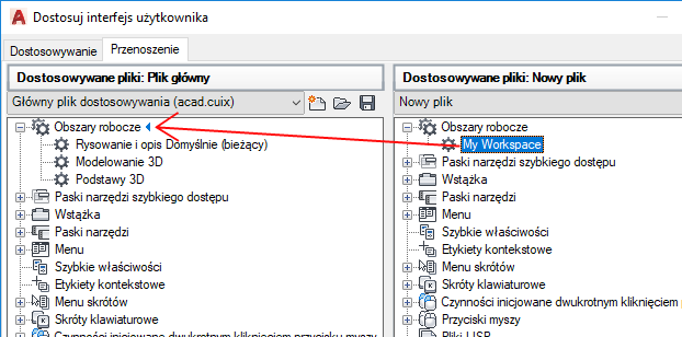 4. W panelu Dostosowywania w <nazwa pliku> (po prawej stronie) przeciągnij obszar roboczy z pliku CUIx do węzła Obszary robocze w głównym pliku CUIx w panelu Dostosowywania w <nazwa pliku> (po lewej stronie).