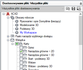 Uwaga: Obok węzłów paska narzędzi szybkiego dostępu, kart wstążki, pasków narzędzi, menu rozwijanych i częściowego pliku CUIx są teraz wyświetlane pola wyboru, więc można dodać elementy do obszaru roboczego.