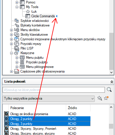 Przeciągnij z panelu Lista poleceń polecenie, które chcesz dodać, do podmenu w panelu Dostosowywane pliki:
