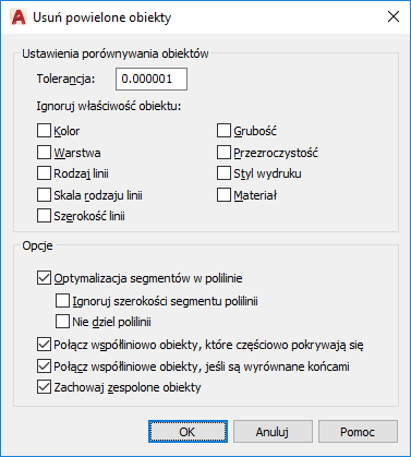 Po wybraniu tej opcji sprawdzane będą poszczególne segmenty linii i łuku w wybranych poliliniach. Powielone wierzchołki i segmenty zostaną usunięte.