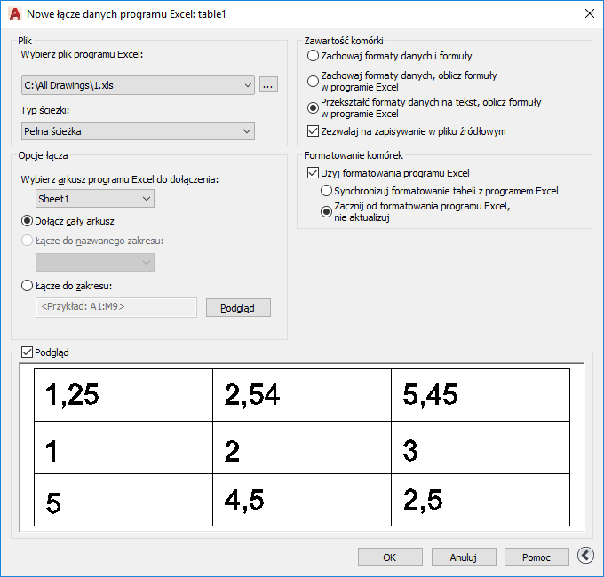 Importuje do rysunku formatowanie określone w oryginalnym pliki XLS, XLSX lub CSV, ale zmiany formatowania nie są uwzględniane w przypadku użycia polecenia AKTUALŁĄCZEDANYCH.