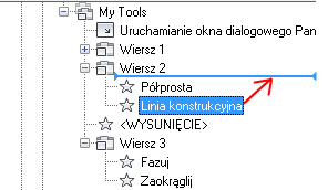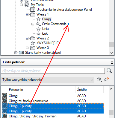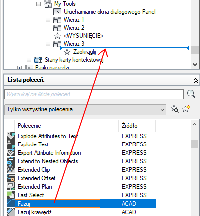 5. Przeciągnij polecenie z listy poleceń do wiersza, podpanelu lub listy rozwijanej na panelu wstążki.