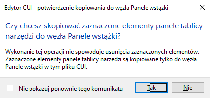 6. W oknie dialogowym Edytor CUI — potwierdzenie kopiowania do węzła Panele wstążki kliknij przycisk Tak.