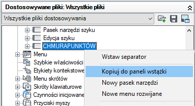 7. Przeciągnij nowy panel wstążki z panelu Dostosowywane pliki: <nazwa pliku> po prawej stronie do węzła Panele wczytanego pliku CUIx na panelu Dostosowywane pliki: <nazwa pliku> po lewej stronie.