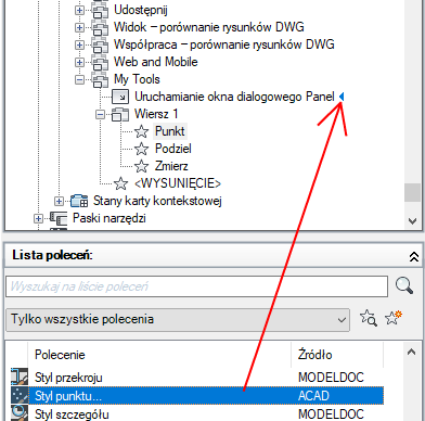 4. Przeciągnij polecenie z listy poleceń do węzła uruchamiania okna dialogowego panelu na tym panelu.
