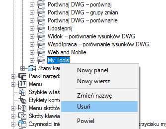 Uwaga: Usunięcia panelu wstążki nie można cofnąć. W przypadku błędnego usunięcia panelu wstążki kliknij przycisk Anuluj, aby zamknąć edytor Dostosuj interfejs użytkownika (CUI) i nie zapisywać wprowadzonych zmian. Spowoduje to jednak anulowanie wszystkich pozostałych wprowadzonych zmian.