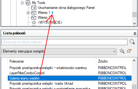 6. Przeciągnij element sterujący z listy poleceń do wiersza na panelu wstążki.
