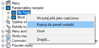 Skopiowany panel tablicy narzędzi jest umieszczany pod węzłem Wstążka Panele.