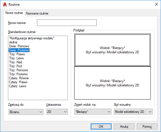 Określa ustawienia 2D lub 3D. Gdy zostanie wybrana opcja 2D, nowa konfiguracja rzutni jest początkowo tworzona przy użyciu bieżącego widoku we wszystkich rzutniach. Gdy zostanie wybrana opcja 3D, zestaw standardowych ortogonalnych widoków 3D zostanie zastosowany do rzutni w konfiguracji.