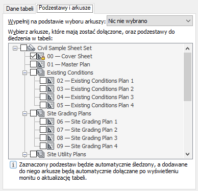 Karta Podzestawy i arkusze (okno dialogowe Tabela listy arkuszy)