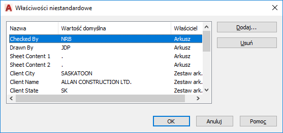 Okno dialogowe Właściwości niestandardowe zestawu arkuszy