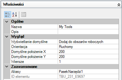 Uwaga: Zmiany wprowadzone tutaj we właściwościach paska narzędzi mają wpływ tylko na początkowy wygląd paska narzędzi po wczytaniu pliku adaptacji (CUIx). Zaleca się kontrolowanie wyglądu paska narzędzi za pomocą obszaru roboczego.
