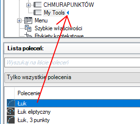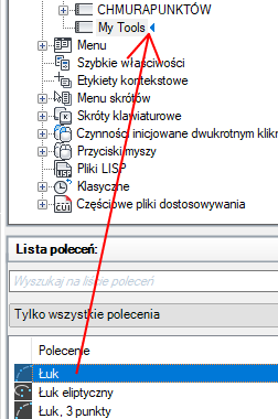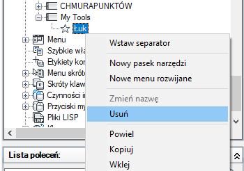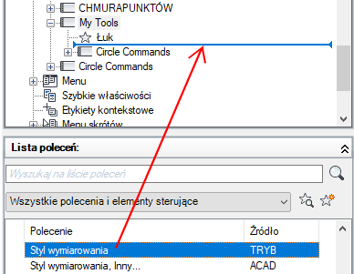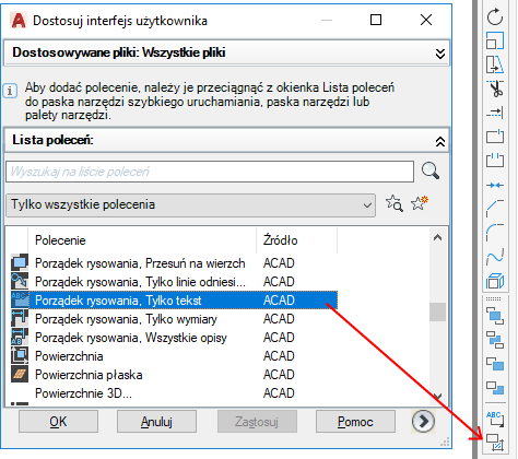 - Na panelu Lista poleceń przeciągnij polecenie, które chcesz dodać, do paska narzędzi na panelu Dostosowywane pliki: <nazwa pliku>.