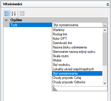 - Na panelu Właściwości, w polu Tryb kliknij strzałkę w dół, aby wyświetlić listę wszystkich dostępnych elementów sterujących paska narzędzi.