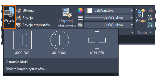 Na karcie Narzędzia główne w panelu Bloki kliknij opcję Wstaw, aby bez otwierania palety Bloki wyświetlić galerię bloków istniejących w bieżącym rysunku. Dwie pozostałe opcje — Ostatnie bloki i Bloki z innych rysunków — powodują otwarcie palety Bloki z odpowiednią kartą.