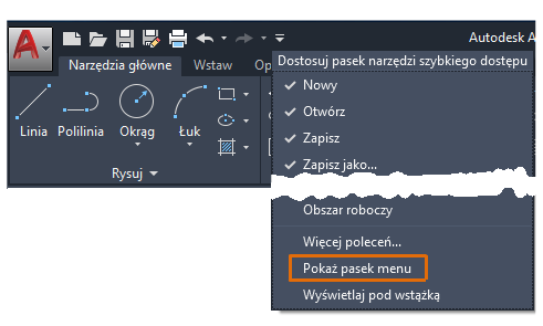 Pasek menu można włączyć z rozwijanego menu paska narzędzi szybkiego dostępu lub za pomocą polecenia CUI umożliwiającego dostosowanie interfejsu użytkownika.