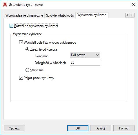 Dzięki funkcji wybierania cyklicznego można wybierać obiekty, które się nakładają, naciskając klawisze Shift + spacja. Można określić, czy niebieska ikona kursora jest wyświetlana w celu wskazania obiektów nakładających się i skonfigurować ustawienia wyświetlania pola listy Wybór.