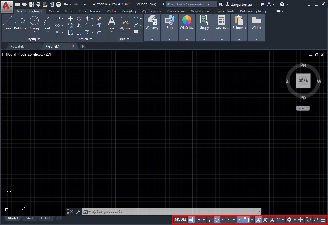 Pasek stanu wyświetla położenie kursora, narzędzia rysunkowe i narzędzia mające wpływ na środowisko rysunku.