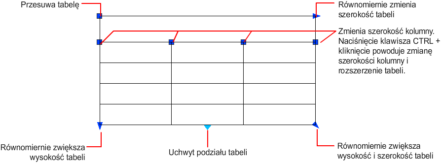 Gdy zostanie zmieniona wysokość lub szerokość tabeli, wówczas zmieni się jedynie wiersz lub kolumna sąsiadująca z zaznaczonym uchwytem. Zostanie zachowana wysokość i szerokość tabeli. Aby zmienić wielkość tabeli proporcjonalnie do wielkości edytowanego wiersza lub kolumny, należy podczas używania uchwytu kolumny przytrzymać naciśnięty klawisz Ctrl.