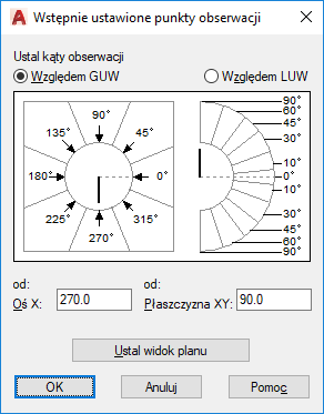 Ustala kierunek obserwacji względem układu współrzędnych układu GUW lub LUW.