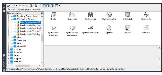 Gdy klikniesz kartę Katalogi lub kartę Otwórz rysunki, to wyświetlane są następujące dwa panele, z poziomu których możesz zarządzać zawartością rysunku: