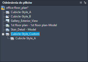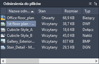 Pierwszym wpisem w kolumnie nazw odnośników jest zawsze bieżący rysunek, po którym następują dodatkowe dołączone pliki w kolejności ich dołączania.