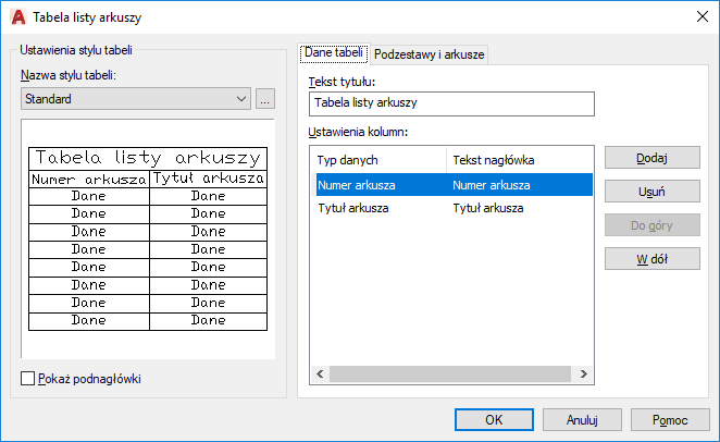 Umożliwia zmianę tekstu tytułu poszczególnych kolumn w tabeli listy arkuszy.
