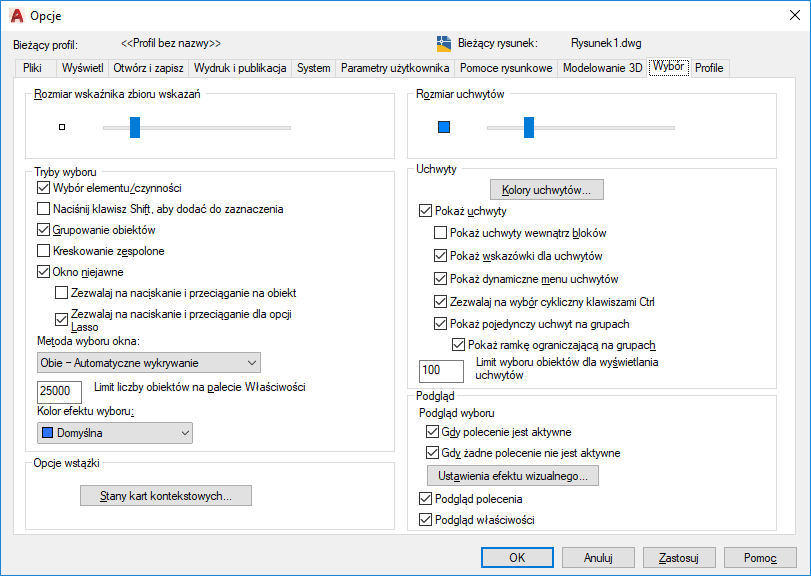 Wyświetla podgląd wyboru, gdy żadne polecenie nie jest aktywne. (SELECTIONPREVIEW — zmienna systemowa)