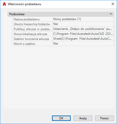 Określa plik szablonu rysunku (DWT) i nazwę układu, który zostanie użyty do tworzenia nowych plików rysunków dla tego podzestawu.