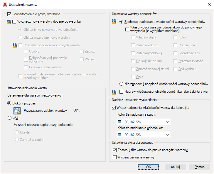 Kontroluje kiedy wyświetlane są powiadomienia o nowych warstwach, zachowanie, gdy niektóre warstwy są izolowane, czy filtry warstw są stosowane do paska narzędzi Warstwy, a także kolor tła nadpisań rzutni w Menedżerze właściwości warstw.