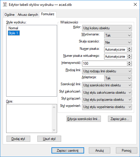 W przypadku przypisania szerokości linii stylu wydruku zastąpi ona szerokość linii obiektu podczas wydruku.