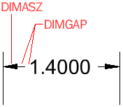 Wartość zmiennej DIMGAP jest także używana jako minimalna długość każdego segmentu linii wymiarowej. Aby zlokalizować komponenty wymiaru liniowego między liniami pomocniczymi, musi być dostępne wystarczająco dużo miejsca na oba groty strzałek (2 x DIMASZ), oba segmenty linii wymiaru (2 x DIMGAP), odstęp po obu stronach tekstu wymiaru (jeszcze raz 2 x DIMGAP) i długość tekstu wymiaru, która zależy od jego wielkości i liczby wyświetlanych miejsc dziesiętnych.